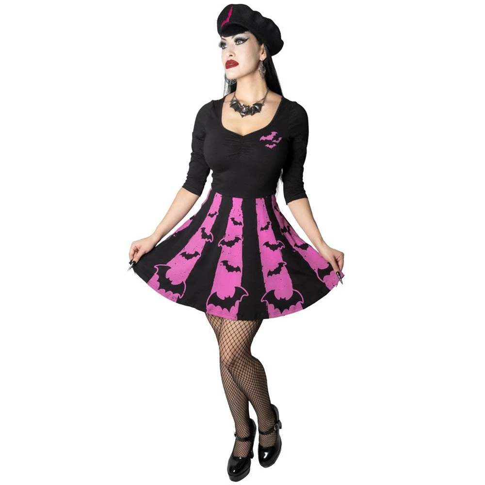 Step into the darkness and unleash your inner vamp with Kreepsville’s Bat Stripe Pink Skater Dress. This batty dress features a small bat flock print on the chest and your very own bat colony flying around bottom on top of black and pink stripes. Crafted of 95% cotton and 5% spandex blend, this dress is lightweight, comfortable, and perfect for any occasion. The flattering skater-style silhouette drapes gracefully over your curves, and the 3/4 sleeve detail and scoop neck with rouging ensure you look your best no matter where you go. Accessorize it with one of our waist belts for a spooktacular, head-turning look. Designed in California.