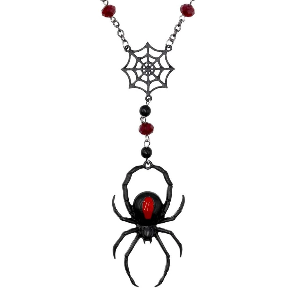 Accessorize your cobwebbed heart with the Black Widow Spider Rosary Charm Necklace by Kreepsville. This gothic necklace is designed to catch all eyes in its web with blood-red and black rosary beads, a creepy black widow spider drop pendant, and a wicked web center charm. The pendant and charm are crafted from a sturdy alloy metal with black finish. Pendant measures approx 2.25″ (6 cm) x 1.25″ (3.2 cm) and necklace circumference approx. 24.5″ (62 cm) with 2″ (5 cm) extender. Designed in California.