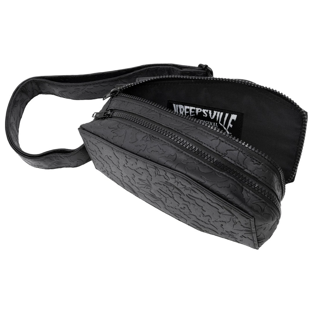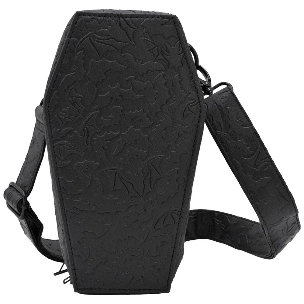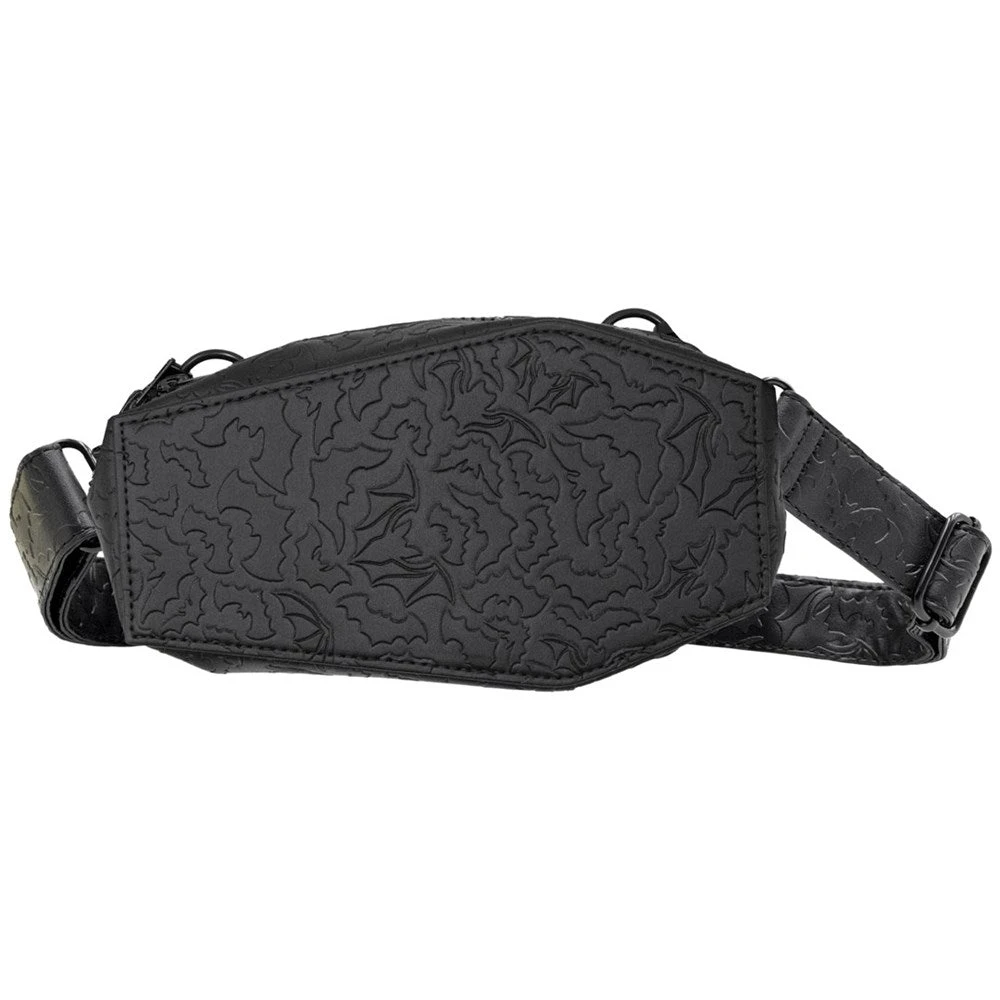 Our Convertible Coffin Hip Pouch returns with a batty revamp! This unique coffin shaped bag can be worn as a hip pouch, shoulder bag, or crossbody purse thanks to its three D-ring attachment points and the adjustable clip on strap that expands from approx. 24″ (61cm) to 45.5″ (115.6cm). Both the strap and bag are made of a high-quality soft vegan leather with an all over embossed bat design for some vamp flair. Includes two zippered compartments; a large one in front and a small one with an id holder in the back! Bag size is approx 8.6″ W (21.8cm) x 4.8″ H (12.2cm) x 2.75″ D (7cm).
