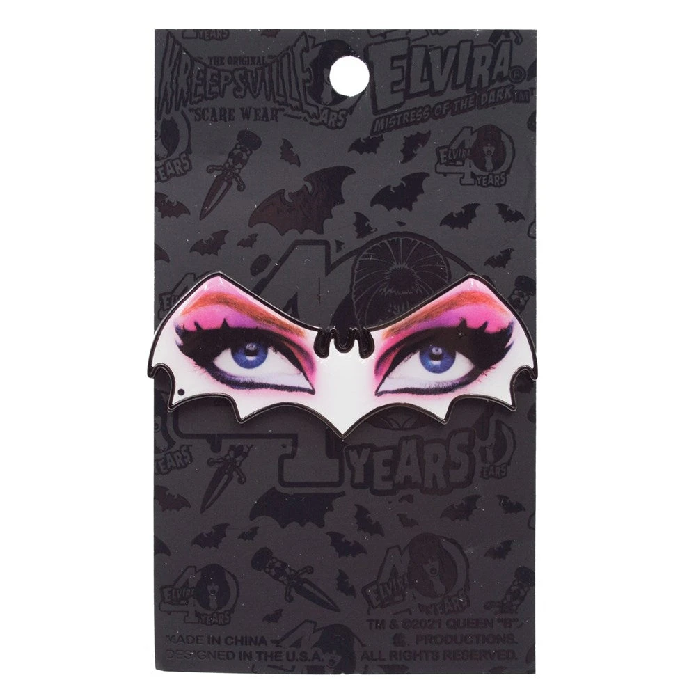 Official Elvira Mistress Of The Dark Elvira Bat Eyes Enamel Pin by Kreepsville . Alloy pin with elvira bat eye design. Size approx 2.5″ (6.3cm) wide x 1″ high (2.5cm).