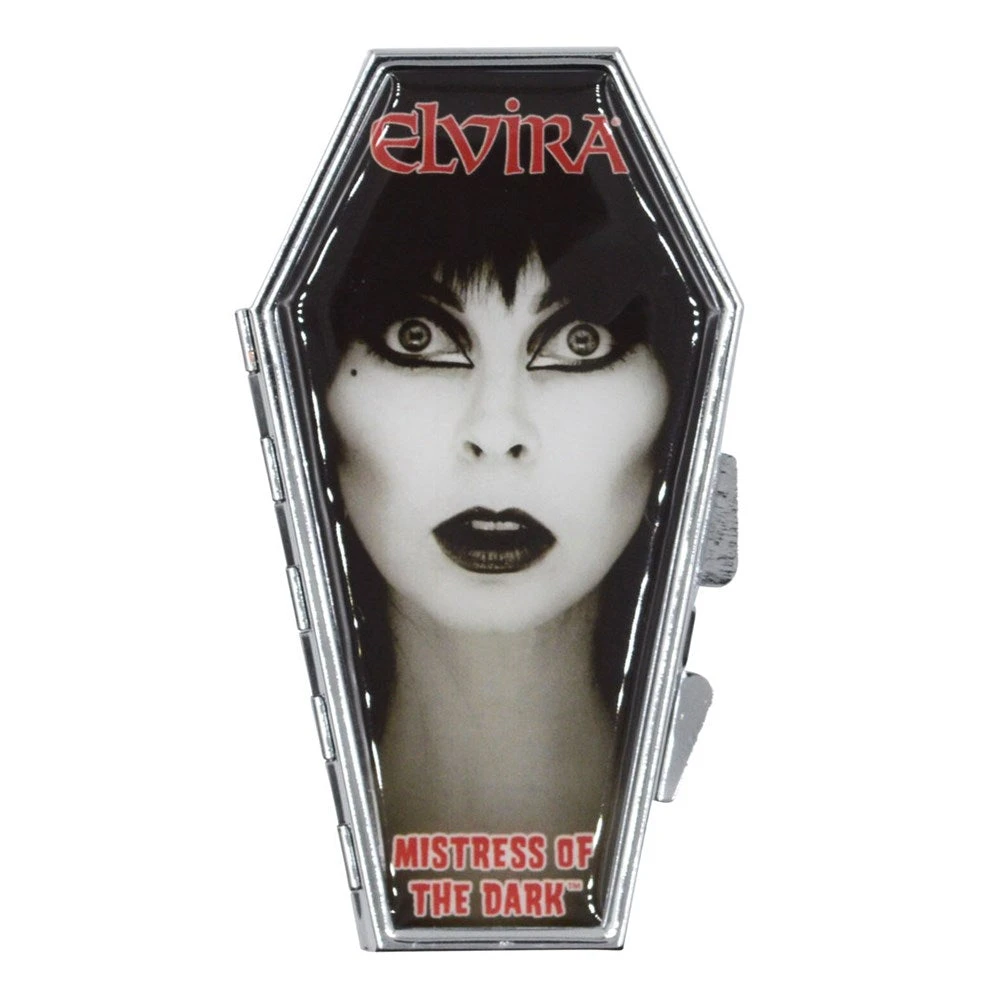 Transform yourself into the haunting beauty of the Mistress of the Dark with Kreepsville’s officially licensed Elvira Face Compact coffin shaped compact mirror, perfect for keeping your 80s glam makeup fierce on the go. This handy coffin compact includes one non-magnified mirror and one magnified mirror inside and fits perfectly in your purse or pocket so you can stay looking your best all through the night. Size approx 4 in. X 2 in. Designed in California.
