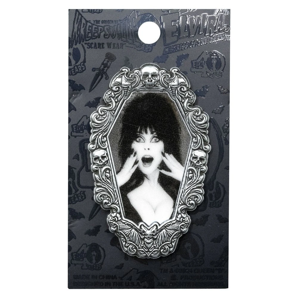 Officially licensed Elvira Mistress of the Dark Hands Gothic Frame Enamel pin by Kreepsville. This eerie enamel pin features Elvira in her classic pose with a gothic metal coffin shaped frame, perfect for pinning on your jacket or bag to add some undead style. Approx 1.5″ W (3.81cm) x 2.5″ H (6cm). Designed in California.
