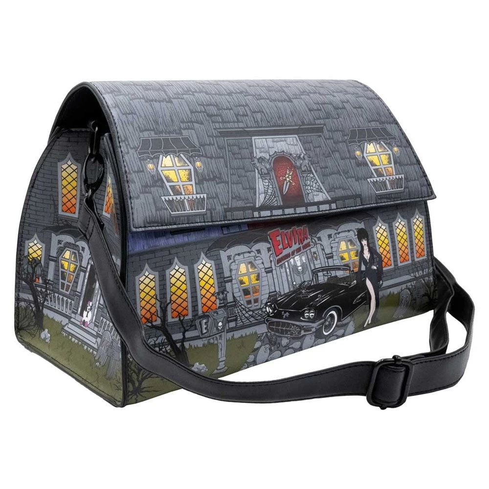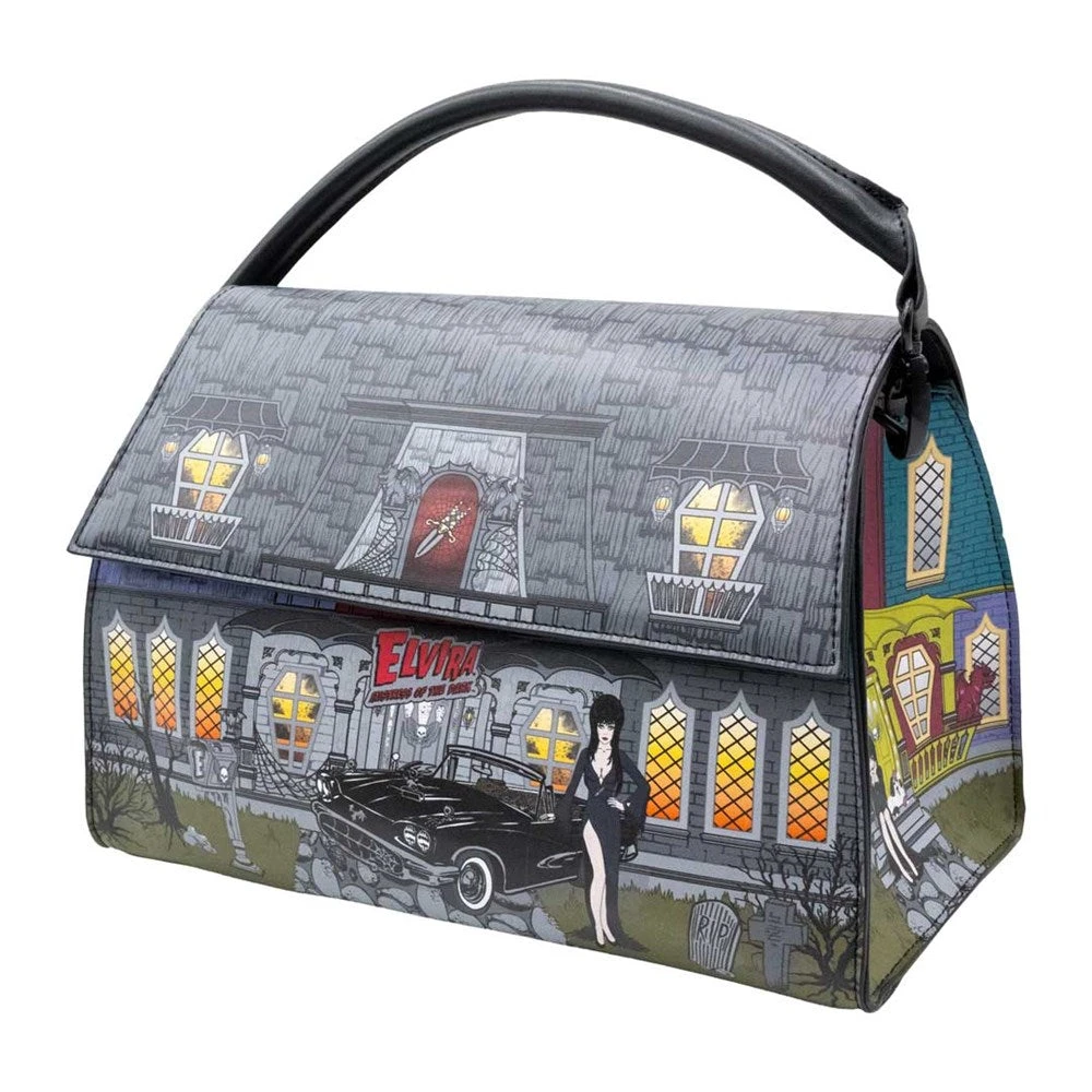Give your purse a Mistress of the Dark home makeover with the officially licensed Elvira Haunted House Doctor’s Bag by Kreepsville. This killer purse has vintage doctor’s bag vibes with an Elvira twist featuring the horror hostess house print that makes the perfect horror home for all your eerie essentials. The structured shape keeps your potions and possessions tidy, with two quick-close magnetic clasps that make getting in and out a scream. Includes a detachable adjustable shoulder strap, detachable hand bag strap, and an inner pocket that keep your treasures from taking a final resting place at the bottom. Bag approx 11″ W (28cm) x 6″ L (15.2cm) x 7″ H (17.8cm).