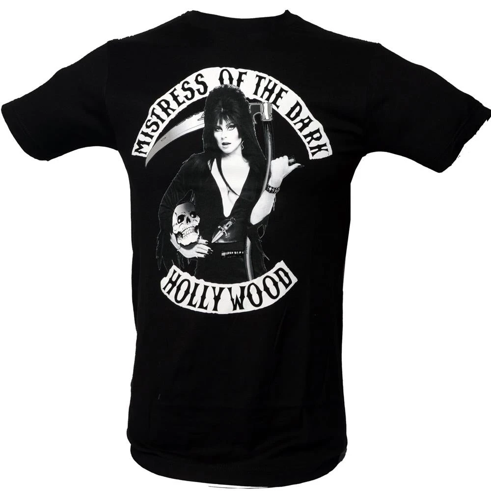 Official Elvira Mistress of the Dark rockers tshirt. Discharged print on black 100% cotton tshirt , made in the USA by Kreepsville.