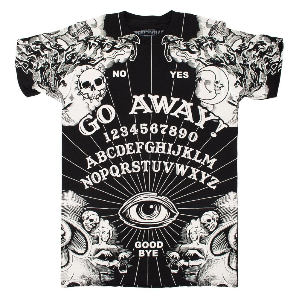Kreepsville Jumbo Go Away Men’s T-shirt featuring an all over jumbo discharge print of Kreepsville’s go away ouija design, printed on 100% cotton. Made by monsters in the USA.