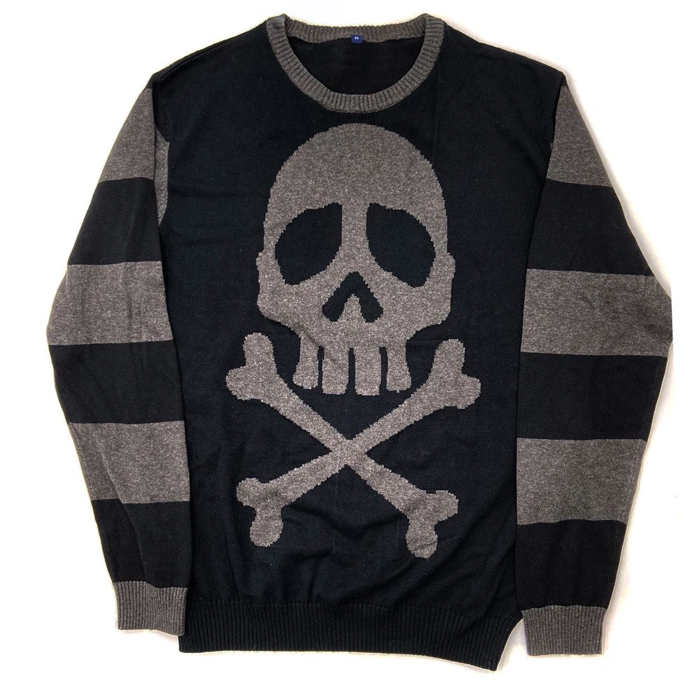 Don’t lose your head in our Harlock Skull Grey Striped Sweater featuring a grey knit skull design on the front and grey striped sleeves made out of 100% cotton.