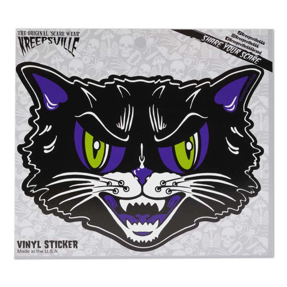 Show off your creepy cat-titude with Kreepsville’s Kattitude Cat Sticker. This vintage halloween inspired sticker is made with a durable curse-resistant and water-resistant vinyl perfect for indoor or outdoor use. The acrylic-based permanent adhesive will easily stick to any surface: crypt, car, coffin, water bottle, skateboard, helmet, laptop, tablet, fridge, headphones, phone case, notebook, etc. Size approx. 3.3″ (8.4cm) x 4.6″ (11.8cm). Printed in the USA.