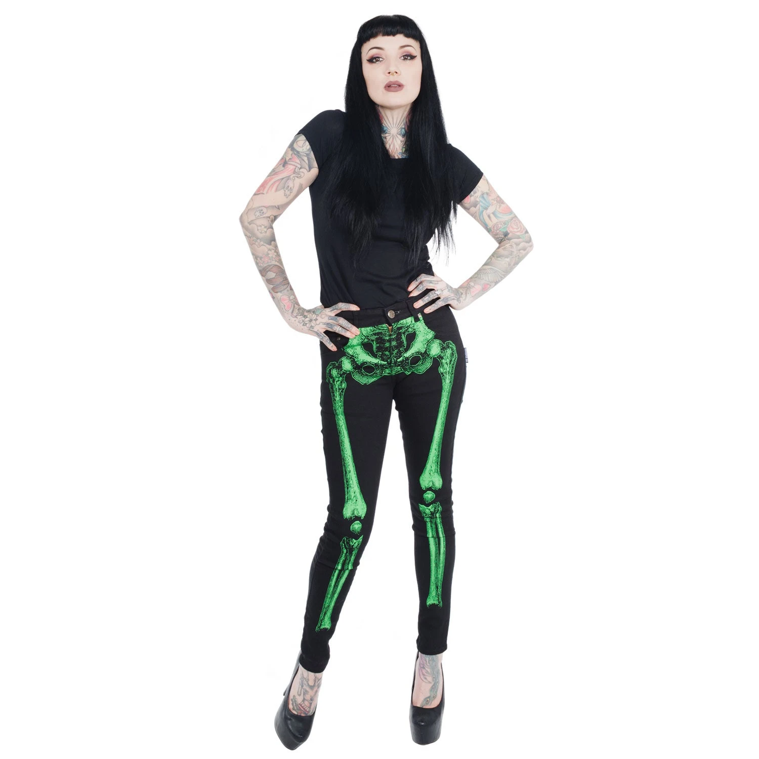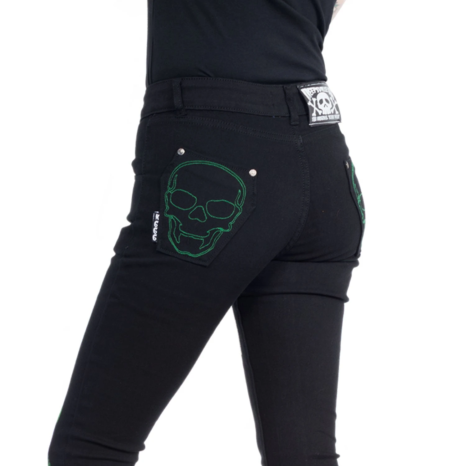 Bad to the bone skeli jeans are back! Green Skeli-bone printed on a medium rise 98% cotton 2% Lycra jeans. featuring back pockets with coffin pockets embroidered with skulls.