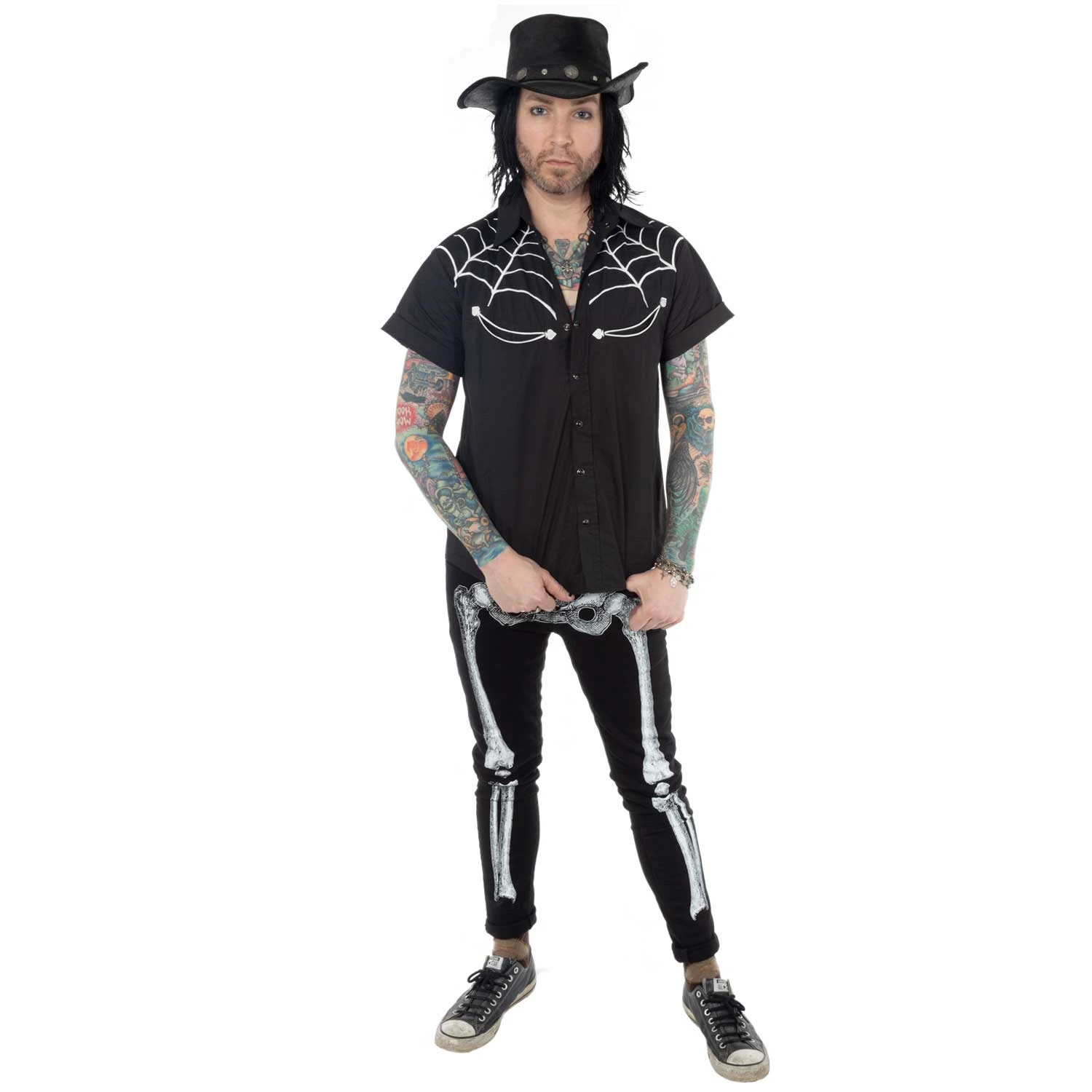 Bad to the bone skeli jeans are back! White Skeli-bone printed on a medium rise 98% cotton 2% Lycra jeans. featuring back pockets with coffin pockets embroidered with skulls.