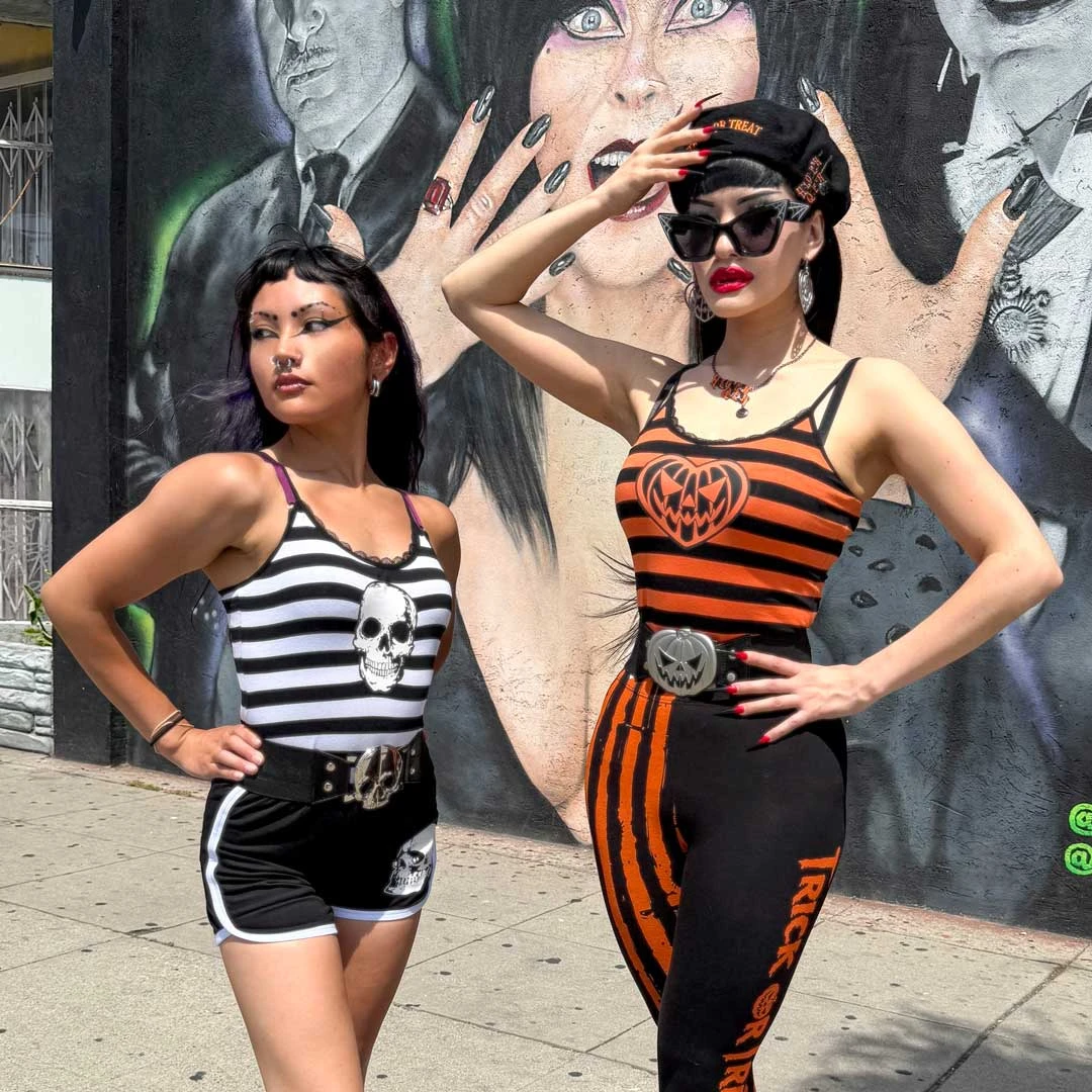 This cami top is for the bone-afide baddies! The Skull Striped Lace Cami Top by Kreepsville is the perfect terror tank for breaking hearts and cracking bones. The sinister skull print, bold black and white stripes, and lace detail will make you the cutest ghoul at the graveyard. Crafted with a spooky soft and stretchy 95% cotton and 5% spandex blend fabric and adjustable tank straps that make for a frightfully fabulous fit.