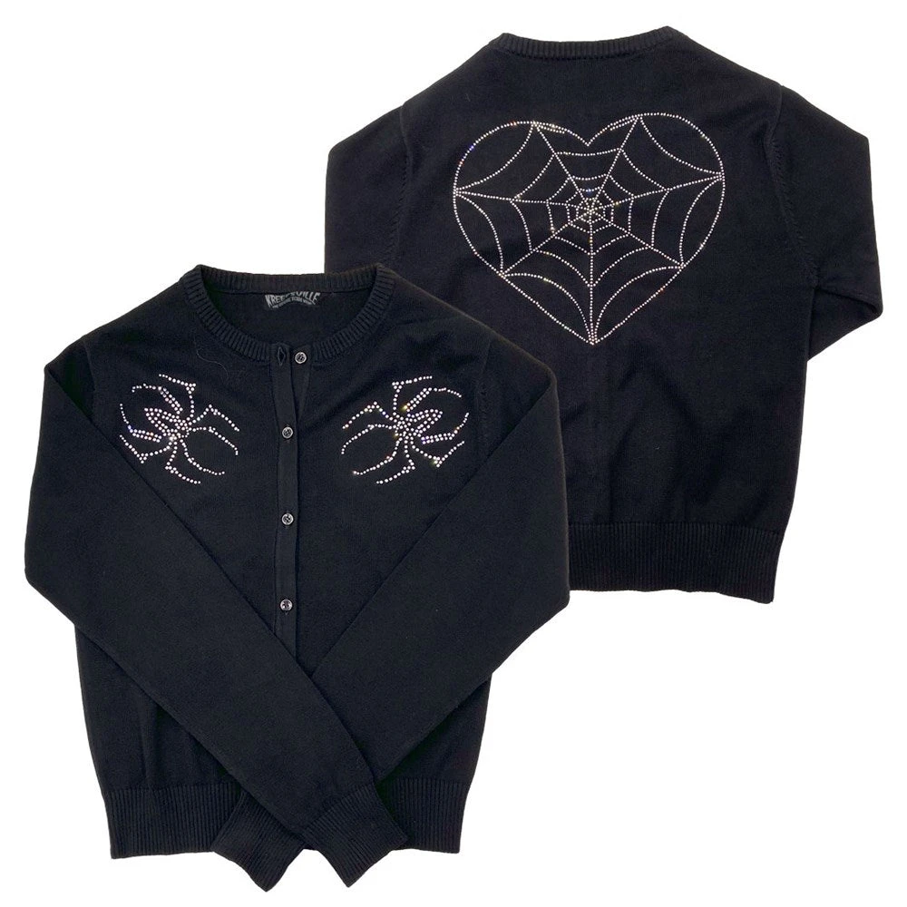 Kreepsville button down Spiderweb Heart Diamond Cardigan , with rhinestone spider designs on the front and rhinestone web heart design on the back made out of 100% cotton.