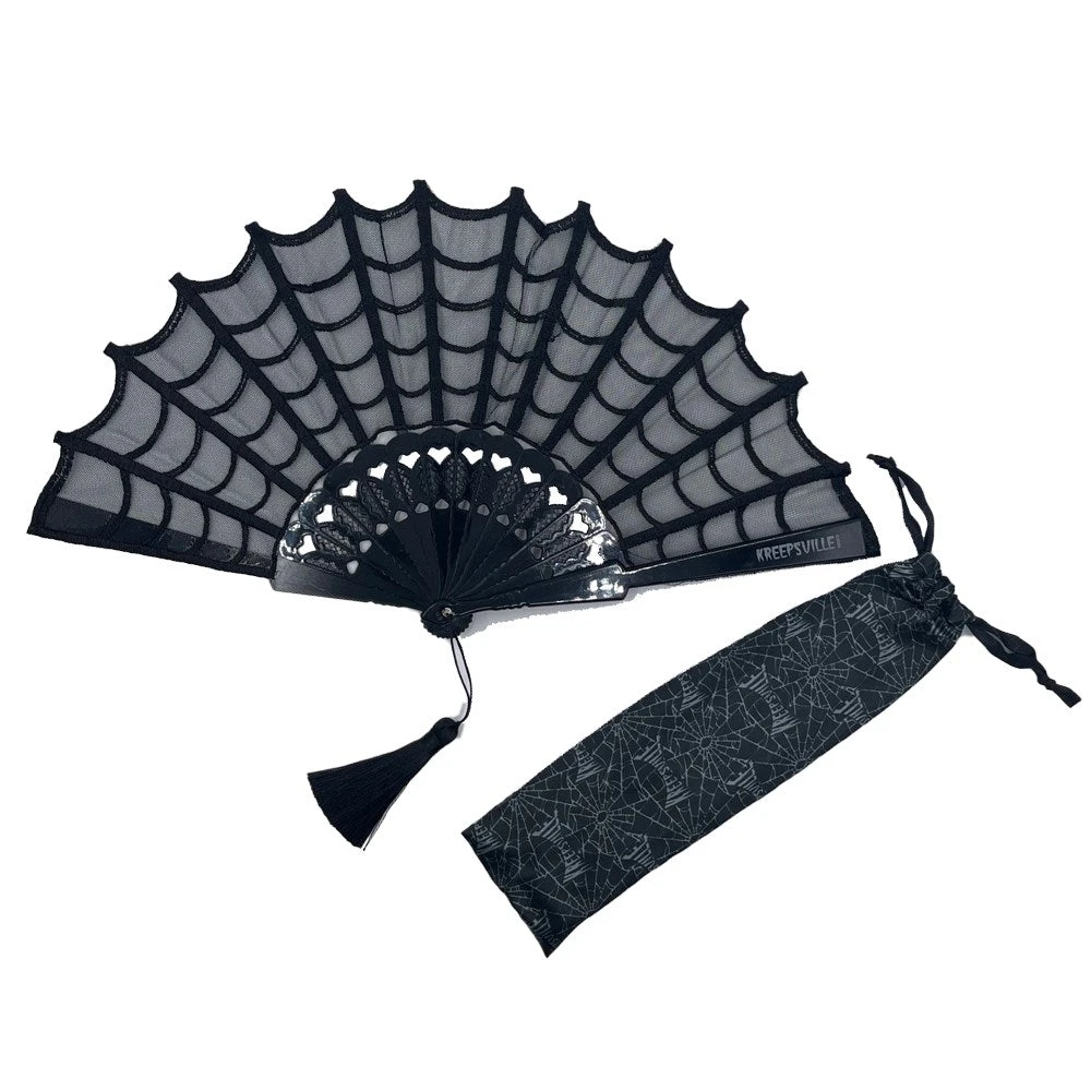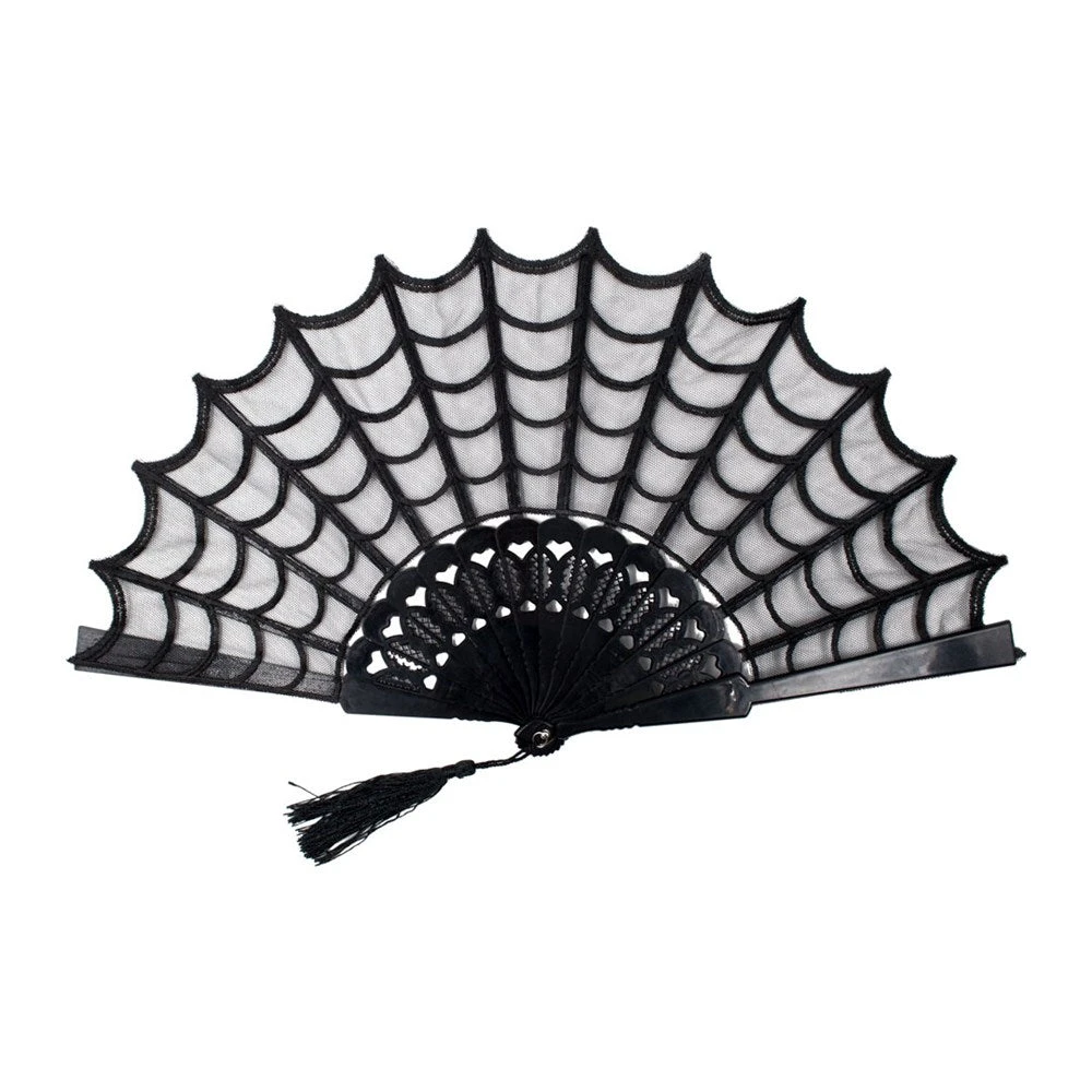 Spiderweb Lace Hand Fan. Black plastic fan with spiderweb lace overlay with scalloped edges . measures approximately 17″(43cm) wide x 9″(30cm) tall when opened.