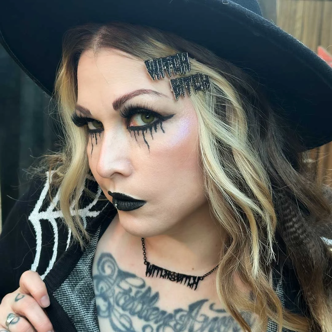 Get ready to be bewitched by Kreepsville’s Witch Bitch Text Hair Slides. These witchy hair slides are made from a silver glitter enamel fill alloy with text size approx 1.5″ L (4 cm) x .75″ H (2 cm) and slide length approx 2.25″ (6 cm). Sold as a set. Designed in California.