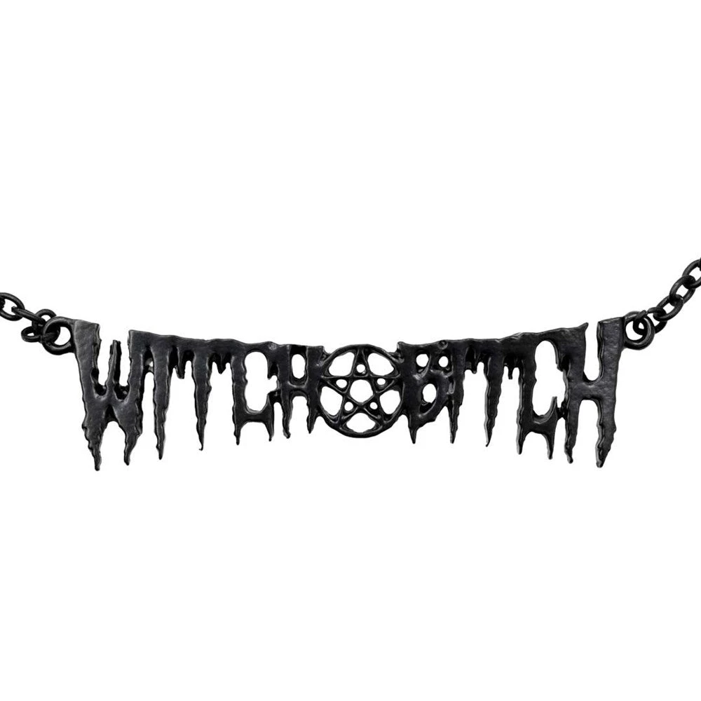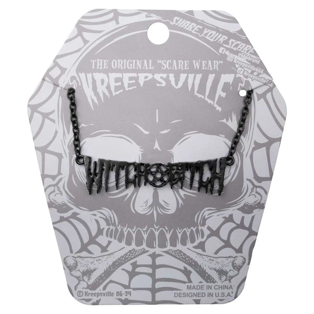 Cast a spell on style with the Witch Bitch Text Necklace by Kreepsville. This bewitched pendant features “Witch Bitch” text and pentacle detail made of a durable alloy metal with black finish. Pendant measures approx 2.5″ (6.4 cm) x 0.6″ (1.5 cm) and necklace circumference approx. 16.5″ (42 cm) with 2″ (5 cm) extender. Designed in California.